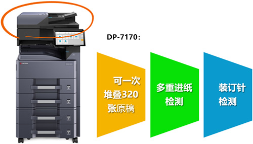 DP-7170/7160输稿器在300dpi的扫描分辨率下,速度高达200页/分钟。DP-7170更配有纸张探测器,防止扫描时多张文稿同时进纸,避免扫描错误。